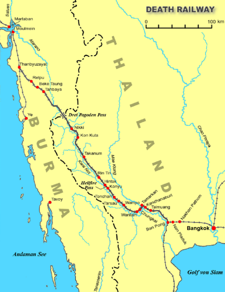 A railway line had to be constructed between Non Pladuk in Thailand (Siam) and Thanbuyuzayat in Burma (Myanmar). The line was supposed to facilitate the supply of Japanese troops and material to the Burmese front. The railway was to be built by the prisoners of war. The prisoners of war were divided into groups to work on a certain trajectory. Each forced labourer had to move one cubic meter of land a day and be proud of the fact that he was allowed to work for the Japanese emperor Hirohito.