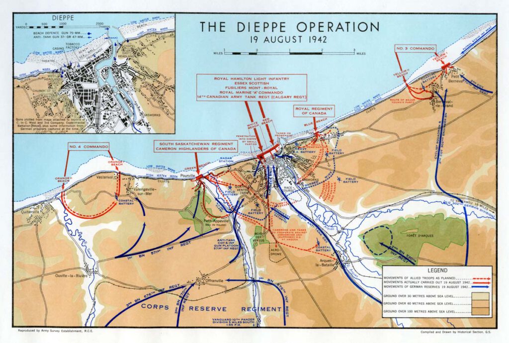 Essex Scottish along with the Royal Hamilton Light Infantry, the Fusiliers Mont-Royal, the Royal Marine and the Canadian Army’s 14th Cavalry Regiment with the Churchill tanks at Dieppe, with the aim of neutralizing two strongholds at the castle and the casino and taking out the batteries “Bismarck” and “Rommel”.