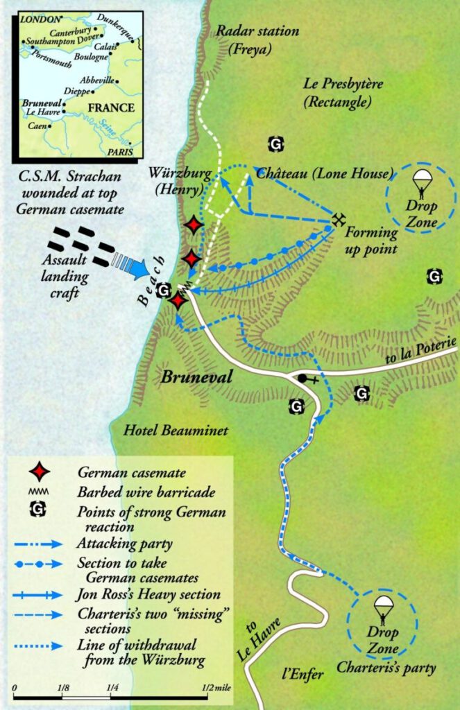 British 4th Commando on two beaches at Vesterival and Varengeville-sur-Mere to take out German artillery.